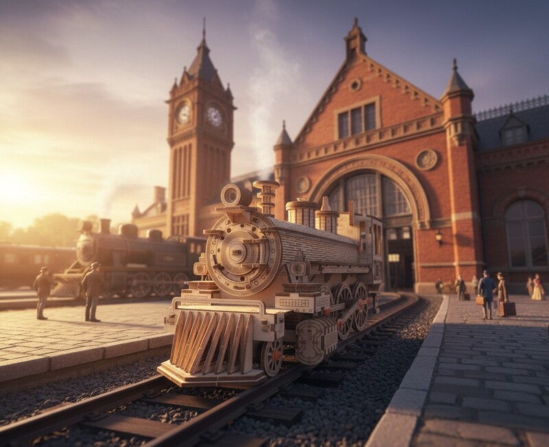 Krásny 3D drevený model historickej parnej lokomotívy vytvoreného do najmenších detailov, ktorý poteší každého fanúšika a poslúži ako pekná dekorácia.