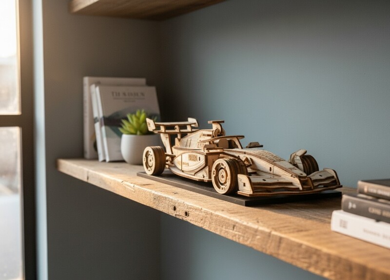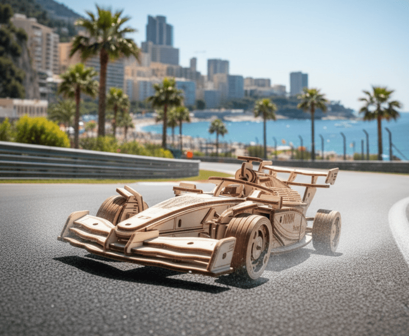Krásny 3D drevený model pretekárskej formule, ktorý poteší každého fanúšika a poslúži ako pekná dekorácia.