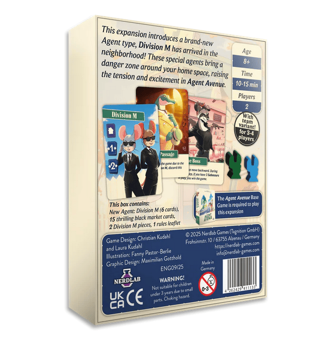 Do susedstva sa nasťahoval nový typ agentov - myšia Divízia M! Počas hry budete vedieť nasadiť do susedstva svojho myšieho agenta, ktorý zvýši nebezpečenstvo odhalenia a chytenia pre nepriateľského agenta. Ak totiž váš súper skončí na konci ťahu na rovnakom políčku ako je váš myší agent, okamžite prehráva. Špiónska hra na mačku a myš je vďaka tomuto rozšíreniu ešte vzrušujúcejšia než predtým!