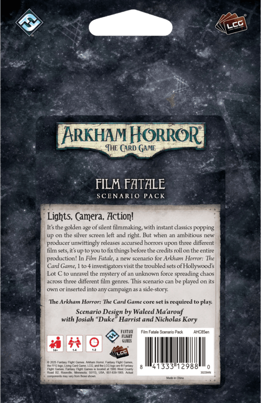 Arkham Horror LCG: Film Fatale: Scenario Pack je malé scenárové rozšírenie pre hru Arkham Horror: The Card Game LCG. Hra je v angličtine a je aj pre hru potrebná, preto jej podrobnejší popis uvádzame v angličtine: