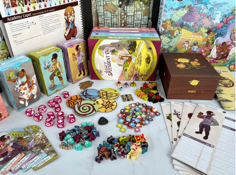 Artisans of Splendent Vale je kooperatívna fantasy dobrodružná stolová hra s bohatým príbehom, v ktorej sa 2-4 hráči ujímajú úloh remeselníkov, každý s vlastnými schopnosťami a príbehom. V magickom údolí Splendent Vale budete spoločne objavovať neznáme miesta, čeliť výzvam a využívať tajomnú energiu na tvorbu mocných artefaktov.