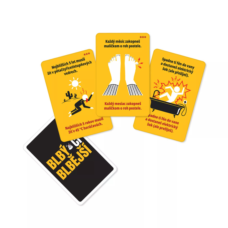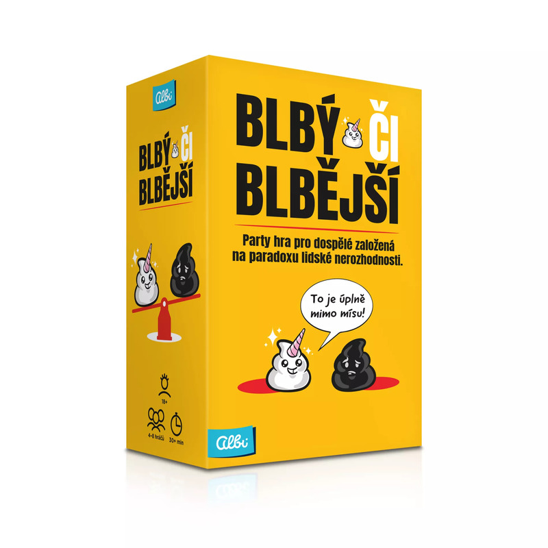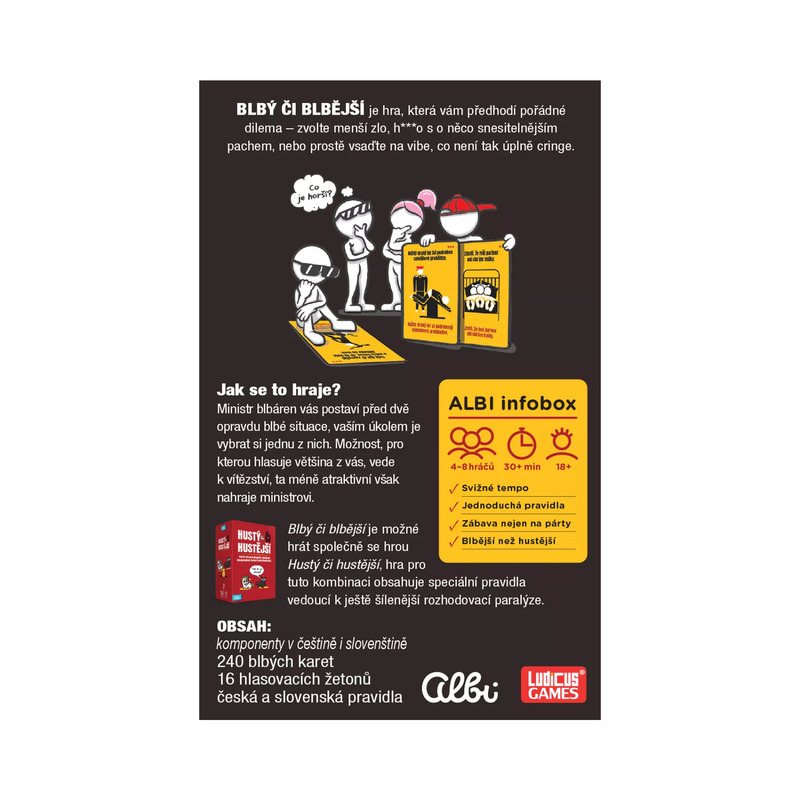 V nekorektnej párty hre Blbý či blbější sa musíte rozhodnúť, ktorá z dvoch možností je menej zlá. Dostanete rôzne nečakané dilemy, ako napr. či je lepšie prežiť celý život vo virtuálnej realite, alebo keď vás niekto nechá visieť týždeň na bungee jumpingu. Je iba na vás, ako sa rozhodnete. Pri tejto hre sa zabaví 4-6 hráčov.