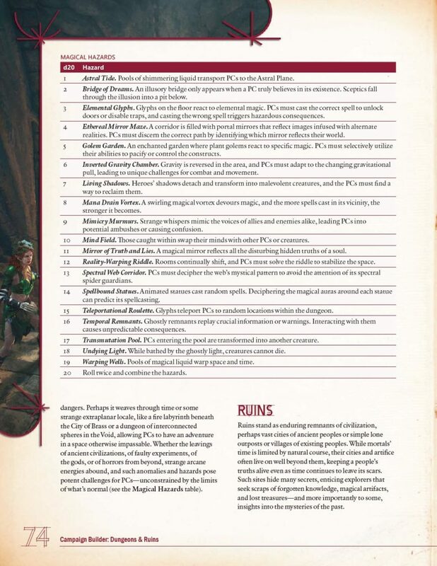 Campaign Builder: Dungeons & Ruins je doplnok pre 5.edíciu hry na hrdinov Dungeons & Dragons(a Tales of the Valiant), ktorý ponúka kompletnú súpravu nástrojov na vytváranie, rozširovanie a vylepšovanie vášho sveta a sústreďuje sa na podzemie a nebezpečenstvá s tým spojené.