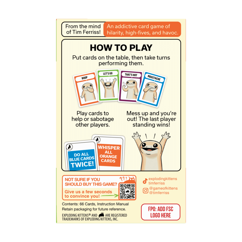 Na každej karte je slovo a aktivita. Vyložte kartu a následne vo svojom ťahu musíte splniť všetky aktívne karty. Môžete využívať aj karty kojotov, ktoré vám pomôžu odsabotovať ostatných hráčov. Ak sa pomýlite, vypadávate.