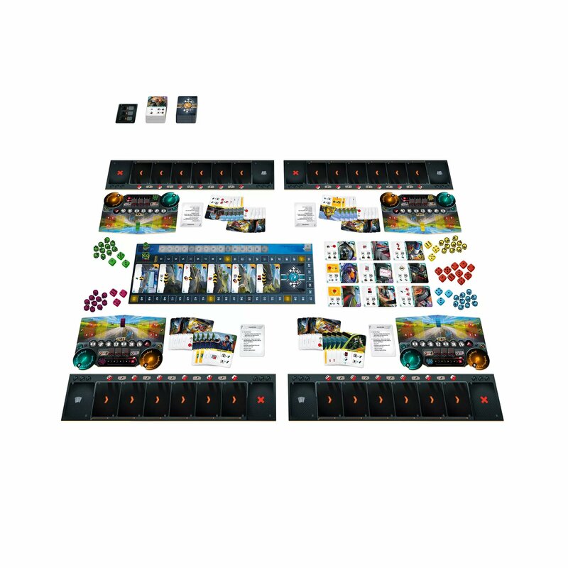 herná doska, 4 hráčske dosky, 4 dosky vozidla, 238 kariet, 14 žetónov hráča, 3 kocky hráča, 12 kociek poškodenia, 10 červených kociek, 1 kocka popularity, pravidlá