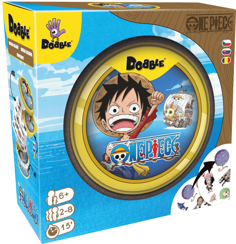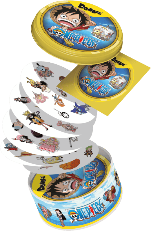 Dobble One Piece je skvelá postrehová hra s jednoduchými pravidlami. Plechová krabička obsahuje 55 kruhových kariet. Na každej karte je osem odlišných a rôzne veľkých obrázkov. Akékoľvek dve karty majú práve jeden z obrázkov rovnaký. Základným princípom hry Dobble je čo najrýchlejšie tento obrázok nájsť. Vyskúšať môžete postupne hneď 5 verzií hry