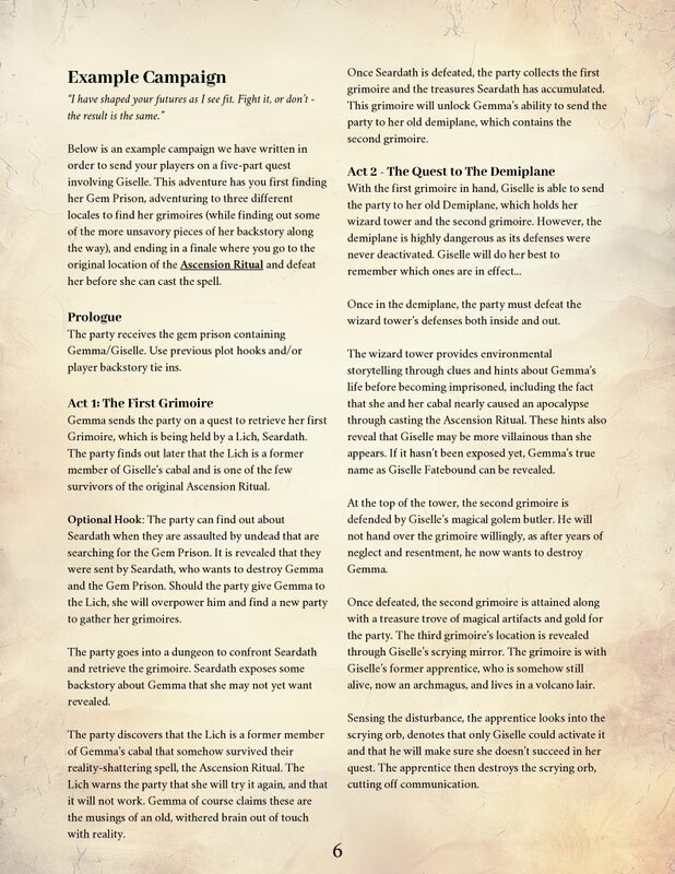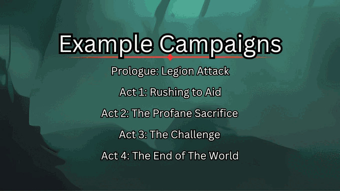 Pre každého zloducha v knihe nájdete príklad kampane, ktorá pozostáva z príbehových úvodov, prológu a 3-5 dejstiev. Každý príklad kampane vydáva vašich hráčov na veľké dobrodružstvo, aby odhalili motívy zloducha, zastavili vlnu skazy a vyvrcholili epickým súbojom. Samozrejme, pokiaľ sa k nim nepridáte.