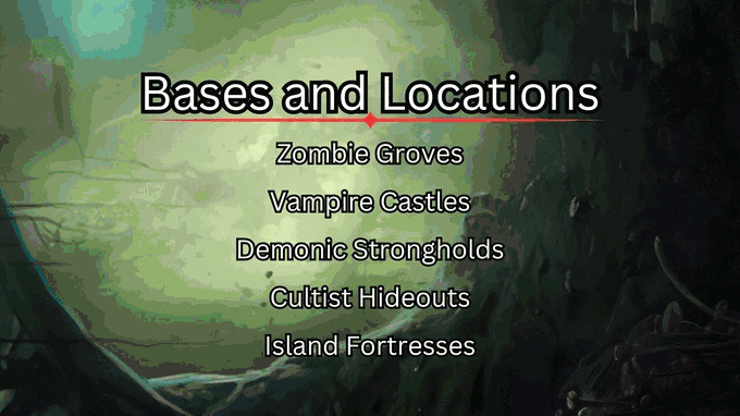 Ktorý zloduch nemá jedno, alebo rovno tri brlohy zla, na ktoré by vaša skupina mohla zaútočiť? Každý zloduch má zaujímavé lokality, kde diktuje pohyb svojich síl, buduje moc, študuje tajomstvá, alebo sa skrátka len ukrýva. Niektorí sú skrytí, zatiaľ čo iní ležia priamo na očiach dúfajúc, že budú vyzvaní.