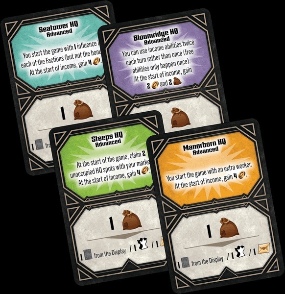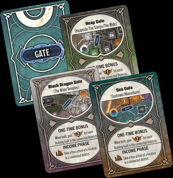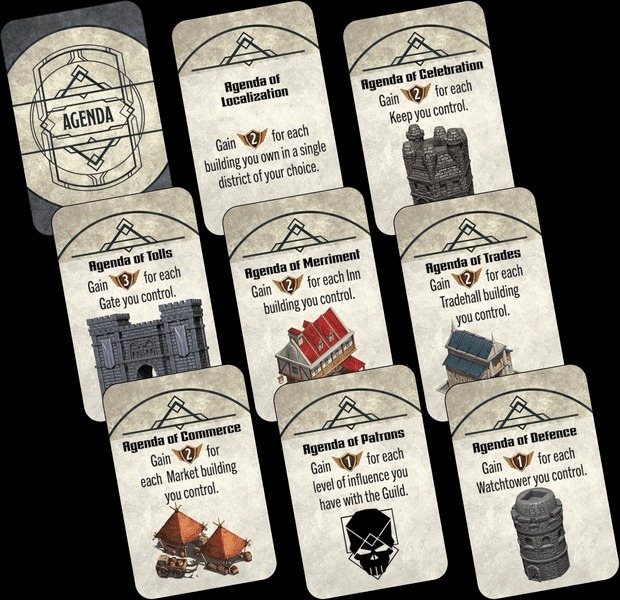 Keď umiestňujete budovy, umiestnite na ne kocku vplyvu, ktorá označuje vašu kontrolu. To platí aj pre špeciálne pevnosti, brány a strážne veže, ktoré sú reprezentované miniatúrami s otvormi pre vaše kocky vplyvu, čo vám umožňuje vidieť mesto rásť v troch rozmeroch!
