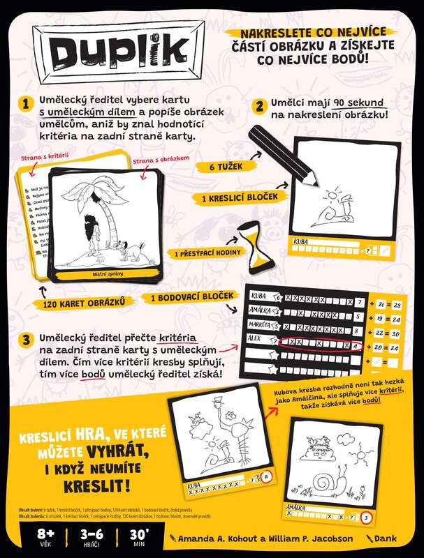Vďaka hektickému časovému limitu hry (90 sekúnd) tak v Dupliku vznikajú skutočne veľkolepé "diela, nad ktorými sa všetci dobre pobavia. Musíte poriadne počúvať umeleckého riaditeľa a čo najpresnejšie nakresliť, čo počujete. Kto bude najlepším umelcom?