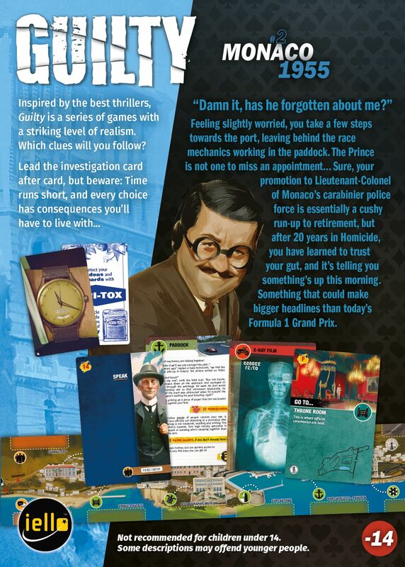 V sérii detektívnych hier Guilty sa ponoríte do náročných detektívnych prípadov, ktoré potrebujete vyriešiť. Tento prípad sa volá Monaco 1955, pretože sa odohráva v Monaku na pozadí Veľkej ceny Monaka. Pustite sa spoločne do lúštenia a hľadania pravdy, skôr ako bude príliš neskoro. Pri riešení tohto prípadu sa zabaví 1 až 4 hráči (aj keď teoreticky sa môže zapojiť ešte viac hráčov).