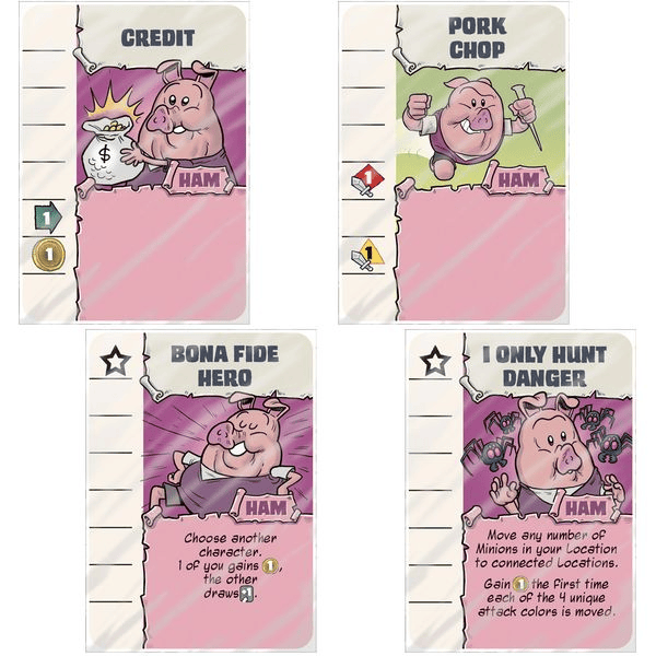 Vyberte si postavu a zoberte si svoj štartovací balíček; každá postava má špeciálnu schopnosť a vlastný balíček s vlastnými kartami, ktoré zodpovedajú jej štýlu hry. Vo svojom ťahu použite symboly na kartách v ruke na cestovanie do nových lokalít (niektoré z nich umožňujú špeciálne akcie), na porazenie prisluhovačov skôr, ako prepadnú lokalitu (každá z nich má limit) a na použitie Knucklesa („nebojácneho“ žoldnierskeho medveďa) na odplašenie prisluhovačov. Pri boji s prisluhovačmi musíte zladiť farby prisluhovača s farbou vášho útoku, aby ste ich porazili. K dispozícii sú štyri rôzne farby, ktoré sa dajú zladiť, a niektorí prisluhovači potrebujú na porazenie dve farby, takže si svoju hru kariet starostlivo naplánujte a nebuďte tvrdohlaví. Niektorí prisluhovači sa vám oplatia, takže si dávajte pozor aj na svoje zdravie.