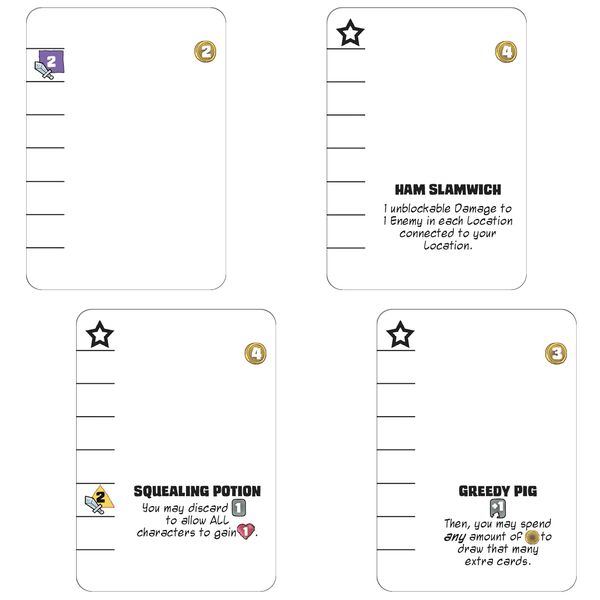 Útočné karty vám umožňujú spôsobiť viac škody v boji, pohybovať sa, liečiť a mnoho ďalšieho. Špeciálne karty sú miestom, kde sa veci stávajú zaujímavými vďaka kombám, zdieľaným bonusom a zosilňovačom poškodenia. Karty vylepšení sú priehľadné, takže ak sa na vašu kartu zmestí symbol, môžete toto vylepšenie vložiť do obalu spolu so základnou kartou. Nielenže je to prasacia dohoda, že doslova vylepšujete svoj balíček, keď porážate prisluhovačov, ale vylepšujete aj karty, ktoré použijete v ďalšom ťahu!