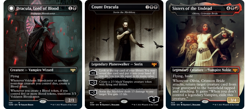Edícia Innistrad: Crimson Vow je inšpirovaná svetoznámym románom Dracula od Brama Stokera z roku 1897. Preto v tejto edícií môžete nájsť až 18 rôznych foilových kariet z tzv. Dracula Series, na ktorých sú rôzne postavy z tohto románu. Až 17 z týchto kariet môžete nájsť v Collector Booster Pack-och, alebo ako Topper Booster Pack. Poslednú 18 kartu môžete získať iba ako Buy-a-Box promo kartu pri kúpe niektorého s booster boxov (Draft Booster Box, Set Booster Box, Collector Booster Box).