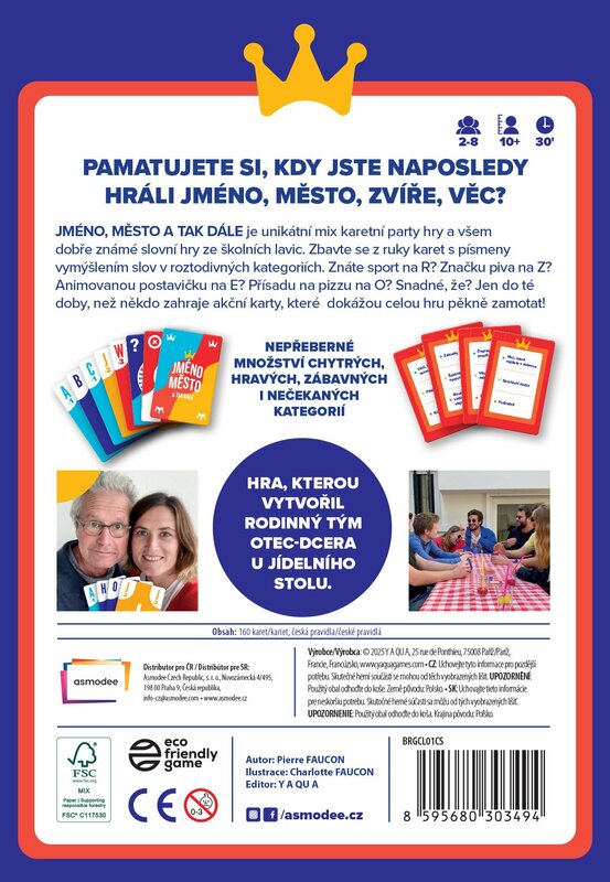 V slovnej hre Jméno, město a tak dále sa 2-8 (v tímoch aj 20) hráči vrátia do svojich detských rokov, kedy ste hrávali takúto hru na kuse papieru. Teraz prichádza v elegantnej kartovej verzii a prináša úplne nové možnosti vďaka akčným kartám.
