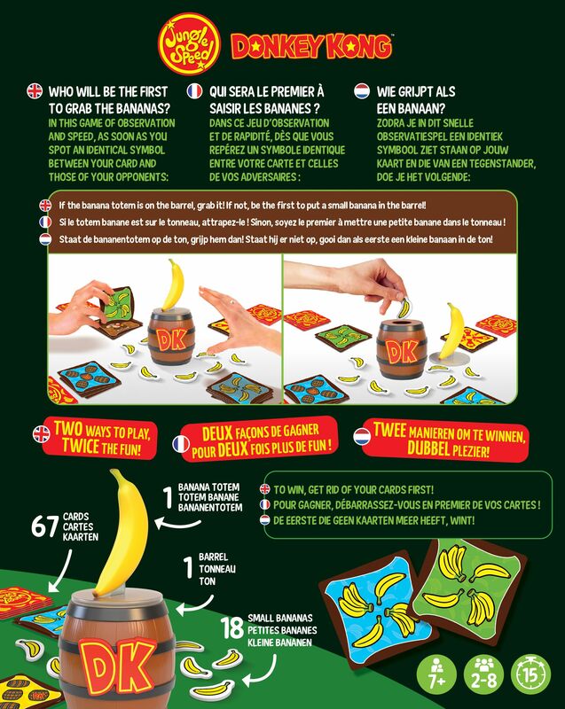 V hre Jungle Speed Donkey Kong sa prekrývajú obľúbená postrehovka s ikonickým univerzom. Pri tejto hre sa snažíte zistiť, či máte zhodné symboly a následne sa čo najrýchlejšie zbaviť svojich banánov. Týchto bláznivých pretekov sa môže zúčastniť 2-8 hráčov.
