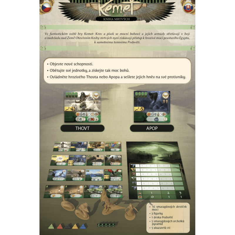 Rozšírenie Kniha mrtvých pre výbornú hru zo starovekého Egypta Kemet: Krev a písek pridáva do základnej hry kompletne novú sadu smaragdových doštičiek moci (vrátane farebných vrcholkov pyramíd) a nový element bodov cti.