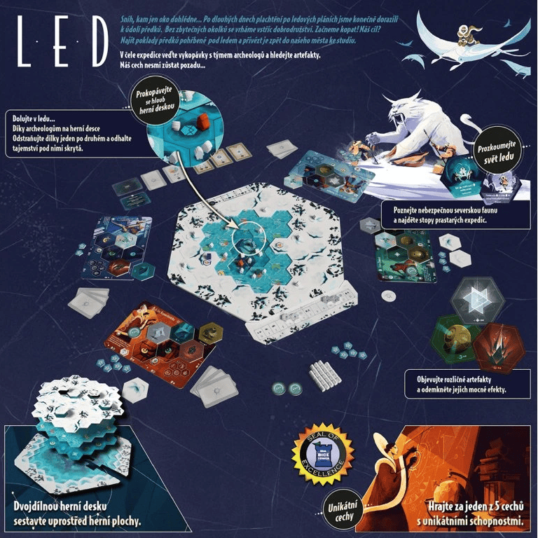 V peknej a náročnej hre LED sa stávate archeológomi v mrazivom prostredí. Počas letnej sezóny sa snažíte dostať cez krusty ľadu do hlbších úrovní a získať čo najvzácnejšie artefakty. Kto z 1-5 archeologických tímov bude najúspešnejší?