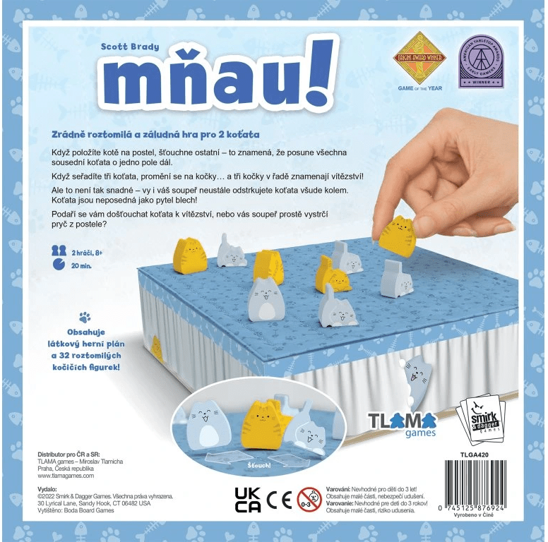V roztomilej, ale zato záludnej hre Mňau sa dvaja hráči snažia dosiahnuť to, že na posteli budú tri ich mačiatka vedľa seba. Mačiatka sú však neposedné a stále sa štuchajú. Podarí sa vám doštuchať k víťazstvu, alebo vás súper zhodí z postele?