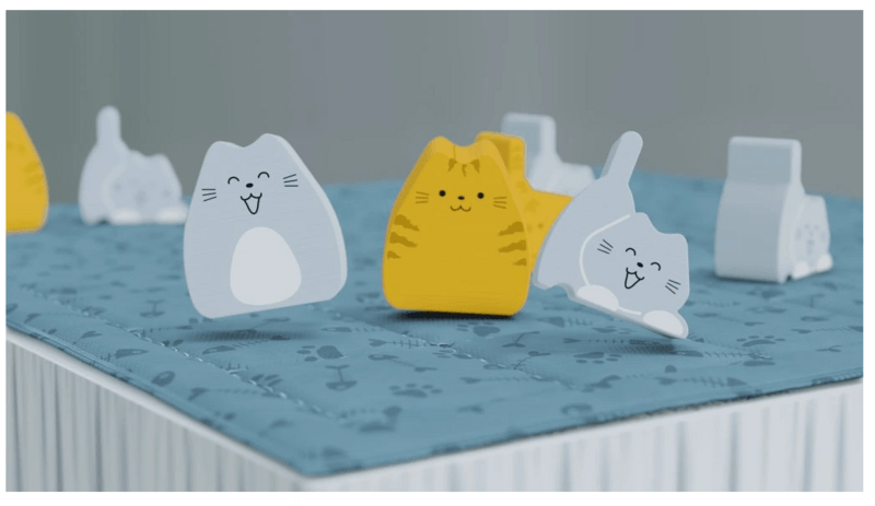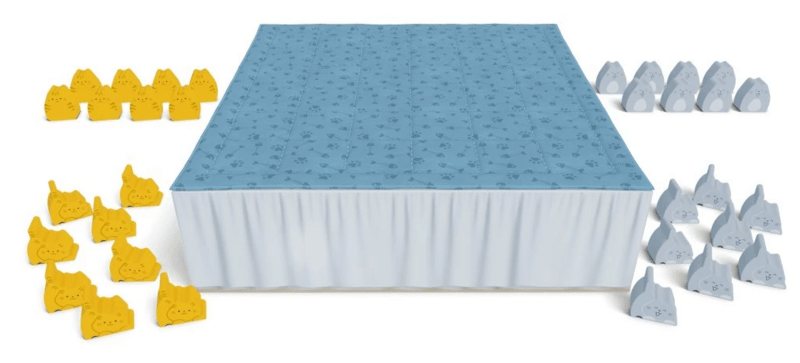 Hra obsahuje prešívaný textilný hrací plán, ktorý položíte na dno krabice, kde sa stretnú mačky a mačiatka v súboji o nadvládu nad posteľou.