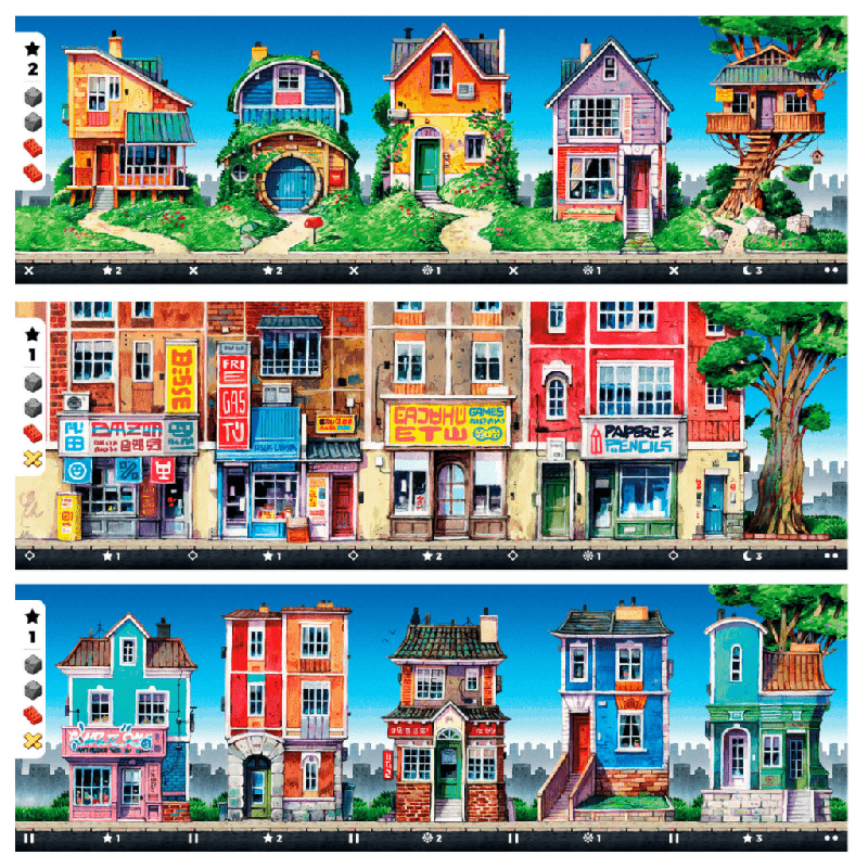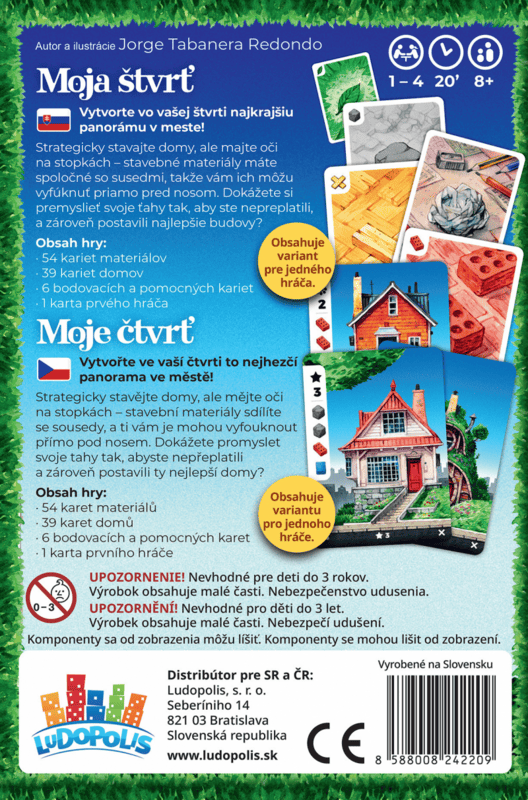 V tejto premyslenej kartovej hre od dizajnéra a ilustrátora Jorgeho Tabaneru Redonda budete stavať domy a prepájať ich do čo najkrajšej panorámy. Znie to idylicky? Áno – až na to, že stavebný materiál je spoločný. A tak si budete musieť dobre rozmyslieť, kedy pridať kartu do trhu a kedy využiť, čo tam zanechali ostatní.