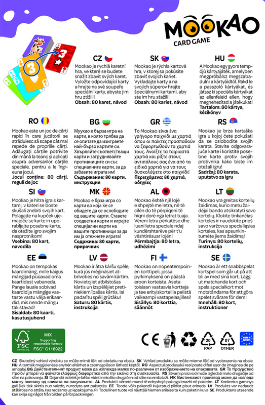 V rýchlej kartovej hre Mookao sa 2-6 hráči snažia čo najrýchlejšie zbaviť svojich kariet vďaka rovnakej farbe, číslu či tvaru. Komu sa to podarí najskôr?