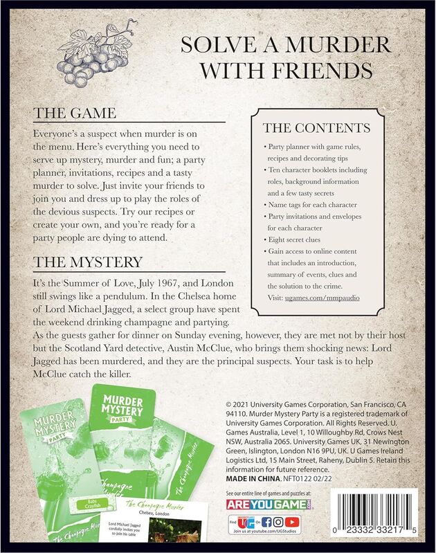 V edícii Murder Mystery Party zažijete detektívku na vlastnej koži. Pozvite svojich priateľov na večeru, a užite si nezabudnuteľný večer plný podozrievania, zábavy, intríg a odhaľovania tajomstiev. Každý z vás sa ujme roly (na podporenie atmosféry sa môžete aj vhodne tematicky obliecť) jedného z podozrivých (a každý môže byť vrahom) a stretnú sa na spoločnej večeri. Podarí sa vám odhaliť vraha, alebo vás všetkých oklame? Na zahratie tejto hry je treba 8-10 hráčov.