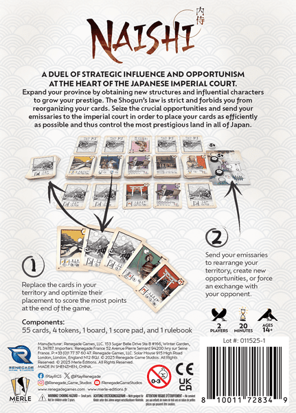 V hre Naishi sa budete snažiť čo najefektívnejšie vylepšiť svoj japonský štát. Nebudete však môcť ľubovoľne meniť umiestnenie svojich kariet. Karty v ruke a na tabuľke musíte nahradiť kartami z centrálnej ponuky, pričom rešpektujete ich umiestnenie. Budete mať tiež možnosť poslať svojich vyslancov, aby reorganizovali štáty, vytvorili nové príležitosti alebo prinútili súpera k obchodu.