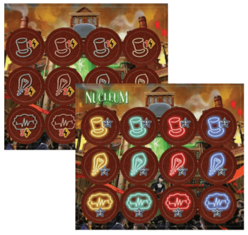 Sada promo žetónov pre hru Nukleum. Každý hráč dostane 3 neónové žetóny. Tieto žetóny zvýšia cenu využívanej energie, ale vďaka nim získate viac ocenení.