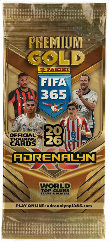 Oficiálne licencované zberateľské karty PANINI FIFA 365 2025/2026 – Adrenalyn Gold packet pre futbalovú sezónu 2025/2026.