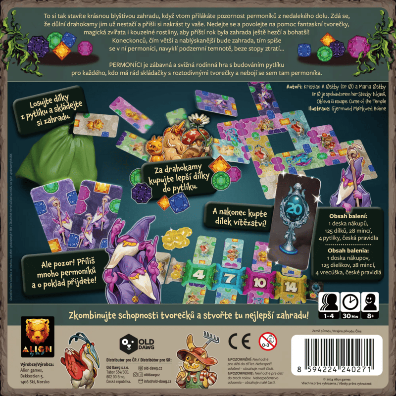 V rýchlej šikovnej rodinnej hre Permoníci sa snažíte vybudovať svoju záhradu vďaka drobným tvorom, ktorí budujú svoje tajné podzemné kráľovstvá. Komu sa podarí nazhromaždiť dostatočné bohatstvo, aby kúpil víťazný pohár? Hru si zahrajú 1-4 hráči.