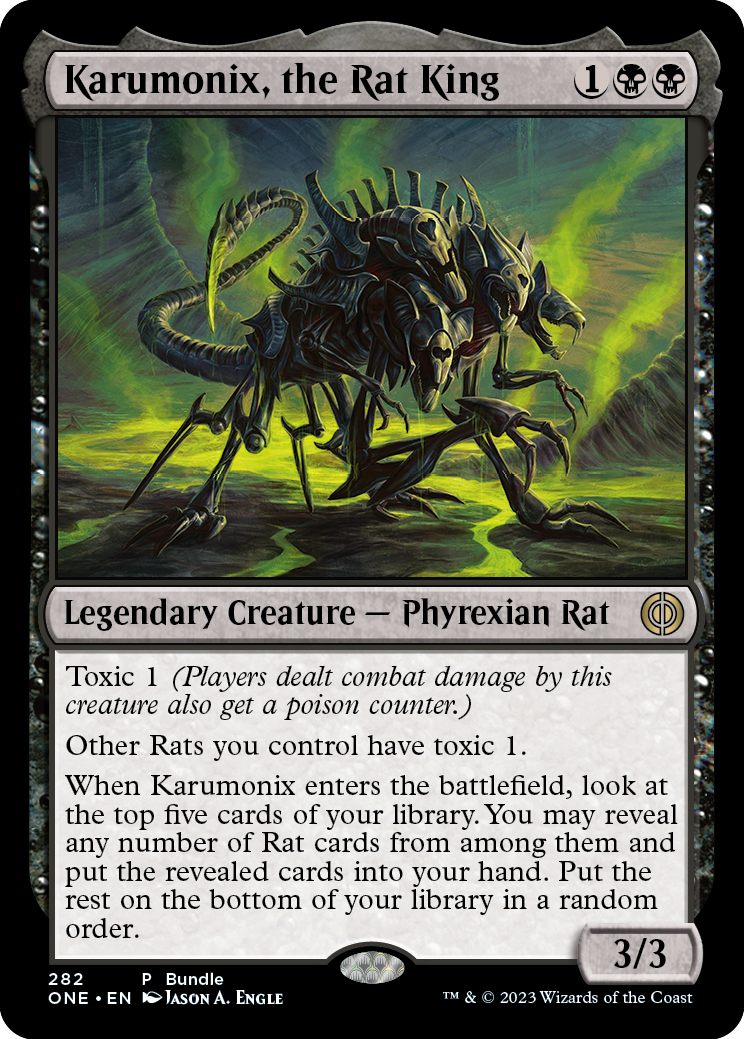 8 Phyrexia - All Will Be One Set Booster Packov20 foilových basic landov20 obyčajných basic landov1 špeciálnu Bundle foilovú alt-art promo kartu Karumonix1 veľkú spindown kocku - počítadlo životov 1 krabicu na uloženie kariet