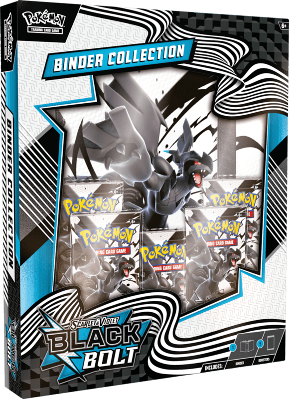 V tejto zberateľskej Binder Collection krabici nájdete album na zberateľské karty veľkosti A4 s počtom strán 21 (stránky nie je možné dopĺňať) a kapacitou 189 kariet (378 pri zakladaní kariet obojstranne), ktorý sa vďaka elastickému pásiku neotvára. V balení sa tiež nachádza 5 Pokémon TCG boostrov (balíčkov) edície Black Bolt.