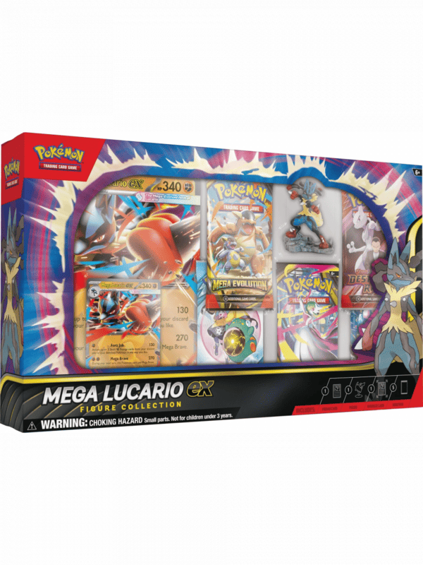 V balení nájdete päť boostrov (balíčkov) hry Pokémon TCG, veľkú Jumbo kartu Mega Lucario Ex, promo kartu Mega Lucario Ex, ako aj prekrásnu maľovanú figúrku Lucaria.
