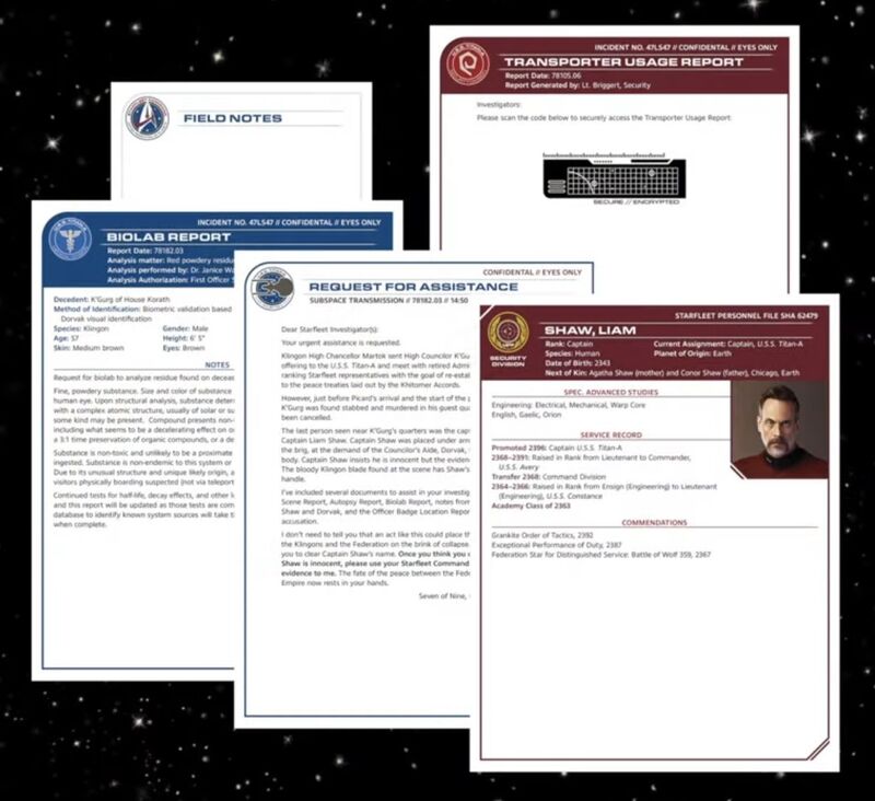Využívajte technológiu rozšírenej reality (čiže ku hre potrebujete smartfón), aby ste získavali pomôcky na riešenie, zisťovali dôkazy a prehrávali citáty Jean-Luc Picarda. Musíte spolupracovať a nájsť riešenie. Pri hre sa zabavia 1-6 hráči.