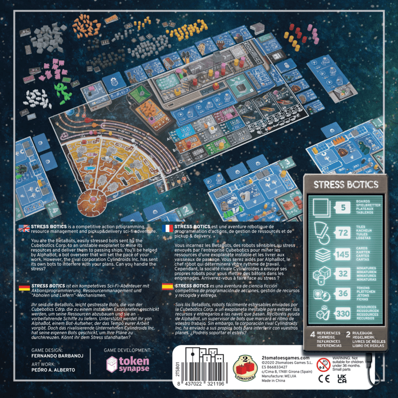 V náročnej a komplexnej hre Stress Botics sa 2-4 hráči stretnú v súťaži o to, koho roboty sa najlepšie osvedčia v ťažbe surovín a dodávaní týchto surovín vesmírnym lodiam. Tieto roboty však musia pracovať v mimoriadne ťažkých a premenlivých podmienkach. Každá loď požaduje iné suroviny a aj načasovanie je kľúčové pre správne dodanie, aby ste získali čo najviac peňazí.