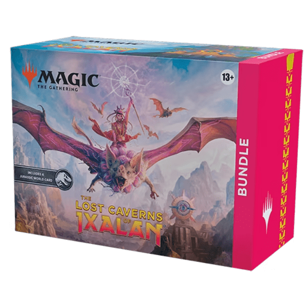 8 The Lost Caverns of Ixalan Set Boosters; each Set Booster contains 12 Magic: The Gathering cards1 Jurassic World™ Card1 Traditional Foil alt-art promo card40 basic lands (20 Traditional Foil + 20 nonfoil)1 Spindown life counter1 card storage box2 reference cards