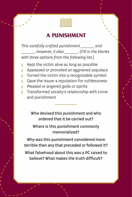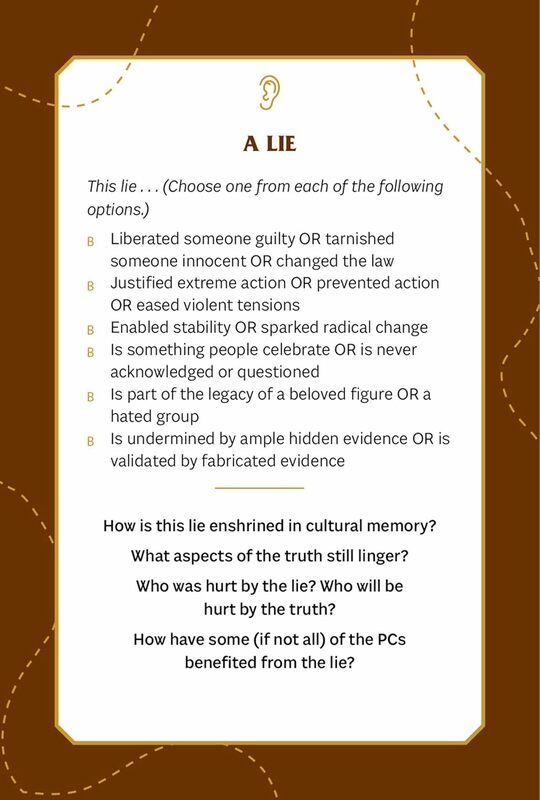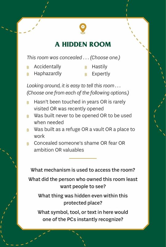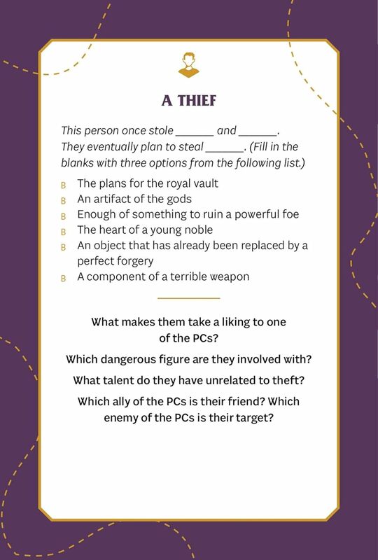 Stačí si vytiahnuť kartu z požadovanej kategórie, vybrať podrobnosti z dostupných možností a odpovedať na výzvy, aby ste určili, kto, alebo čo sa pridá k vášmu svetu a ako sa prepojí s vaším existujúcim príbehom a dobrodruhmi. So 75 rôznymi kartami v balíčku budete mať množstvo hernej inšpirácie priamo na dosah ruky.