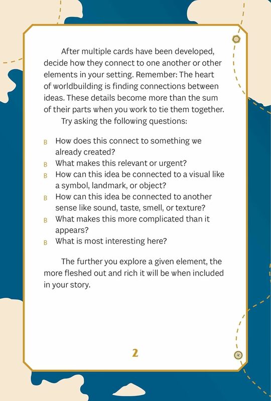 Vďaka tomuto zábavnému a ľahko použiteľnému balíčku 75 kariet s výzvami a nápadmi, je budovanie sveta rýchle ako otočenie karty. Pomôžte si tak zaplniť herný svet ľuďmi, frakciami, destináciami a tajomstvami.