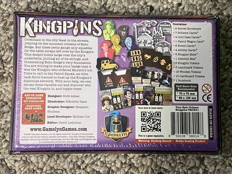 Vďaka rozšíreniu Kingpins pre hru Tiny Epic Crimes si užijete ešte viac zábavy a napätia. Do temných ulíc Echo Ridge City prichádza niečo väčšie... Rozšírenie pridáva do základnej hry novú dimenziu: jeden zo šiestich nebezpečných Kingpinov ovládol celé mesto a detektívi musia vypátrať, kto stojí za vraždou. Ale pozor — ktorý boss to je, zistíte až počas hry!