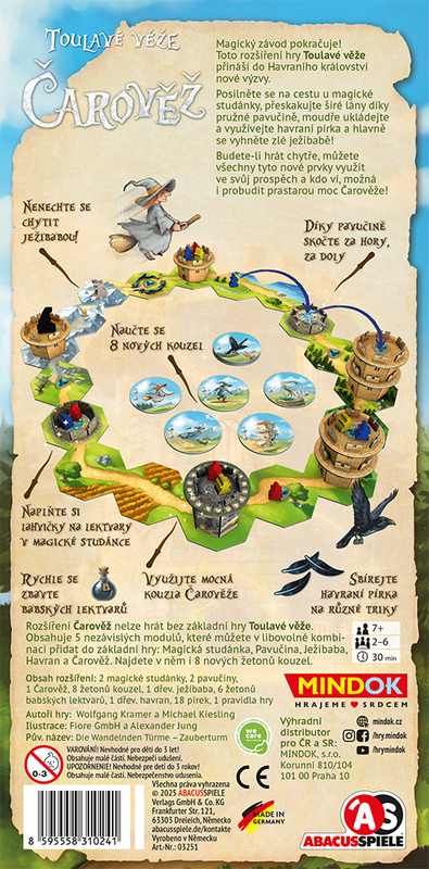 V rozšírení Čarověž pre obľúbenú rodinnú hru Toulavé věže objavíte nové možnosti, ako sa dostať čo najrýchlejšie do Havranieho hradu a viac interakcií. Musíte sa postaviť novým strategickým výzvam a užiť si ešte viac zábavy.