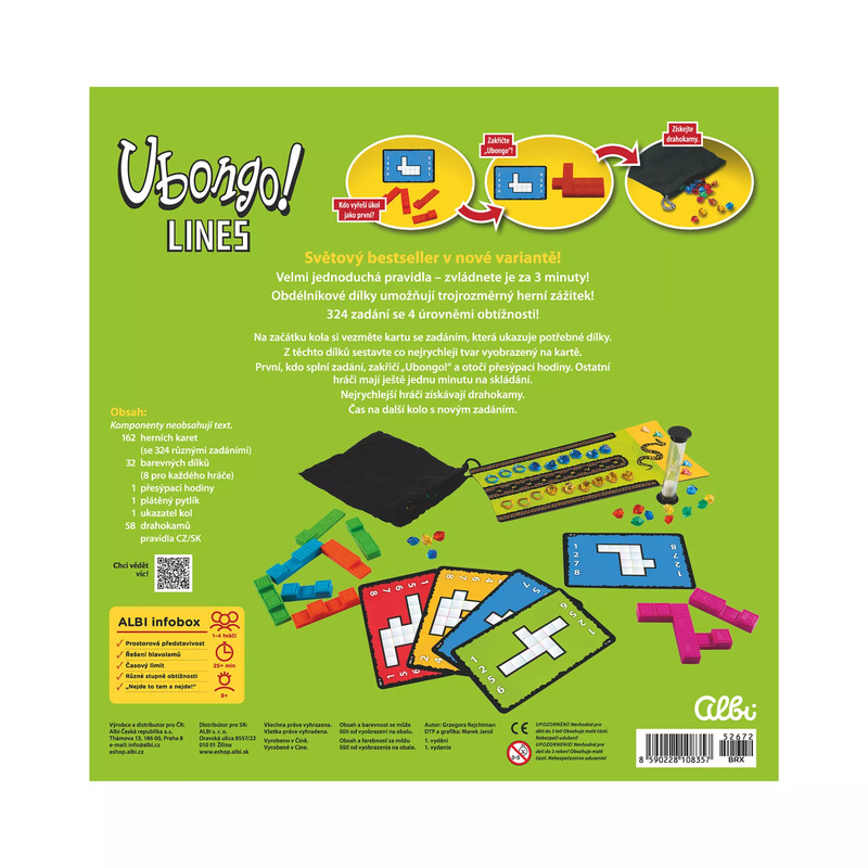 Nový variant známej a obľúbenej hry Ubongo vo verzii Lines, ktorý ponúkne ďalšie zážitky pre 2-4 hráčov. V tomto variante sa stretnete s obdĺžnikovými trojrozmernými dielikmi a pokúsite sa čo najrýchlejšie poskladať dieliky podľa zadania a získať čo najviac diamantov.