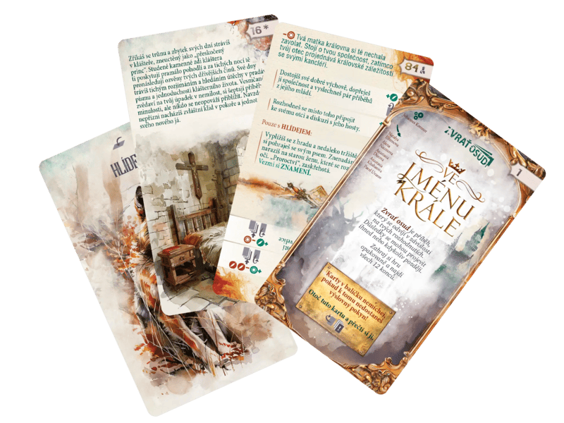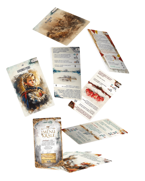 V príbehovej sólovke (hoci sa to dá hrať aj v skupine, kde sa dohodnete, ako budete postupovať) Ve jménu krále sa stávate následníkom trónu, ktorého rozhodnutia budú formovať celú ríšu. Musíte sa vysporiadať s dvornými intrigami, politickými machináciami a dôležitými rozhodnutiami, ktoré môžu priniesť slávu a blahobyt, ale aj rozvrat ríše. Celá hra je riadená kartami, ktoré rozvíjajú príbeh a stavajú vás pred rôzne rozhodnutia (riešenie diplomatických sporov, spravovanie financií či potláčanie vzbury).