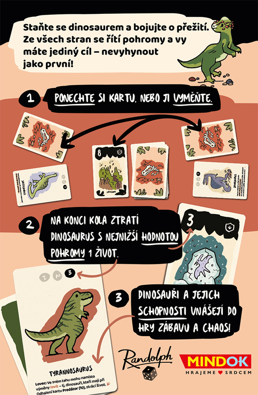 V hre Velmi vymírajíci dinosauři: Žhavý REX sa ocitnete v dobe dinosaurov, ktorá nie je vôbec ľahká a každý deň sa vyskytne určitá katastrofa. A vaším jediným cieľom je prežiť (alebo aspoň byť živý dlhšie, ako iný dinosaurus). Do tohto veľkého a zúrivého boja o prežitie sa môžu zapojiť 3-6 hráči a zvládnu si ju zahrať aj rodiny, či začínajúci hráči.