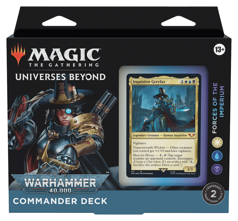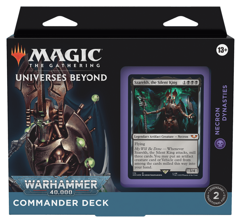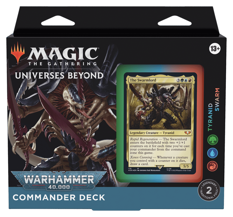Nová sada 100-kartových Commander deckov z edície Commander Warhammer 40K, ktorá spája svet Magic: The Gathering s iným obľúbeným herným fenoménom - Warhammer 40K. Sada obsahuje 4 Commander Deck-y - Tyranid Swarm, The Ruinous Powers, Necron Dynasties a Forces of the Imperium. Každý balík obsahuje 100 kariet (2 traditional foil + 98 nonfoil), 1 Foil-Etched Display Commander, 10 tokenov, 1 life tracker + 1 deck box.